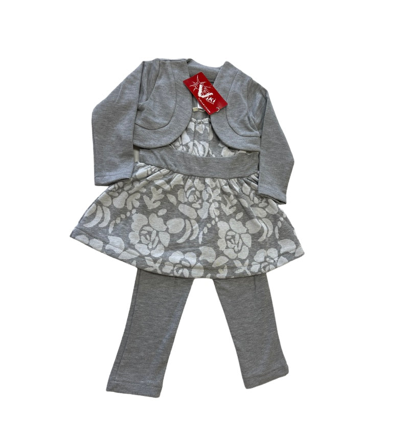 Бебешкото комплектче е умен избор за пролетните дни. То включва три части - късо сако, рокля и клинче, съчетани в перфектна хармония. Комплектът е в нежен сив цвят, който придава дискретност и стил. Сакото е стилно и интелигентно, роклята е игрива и детска, а клинчето осигурява комфорт и свобода на движение. Този уникален комплект ще направи всяко бебе незабравимо и очарователно.