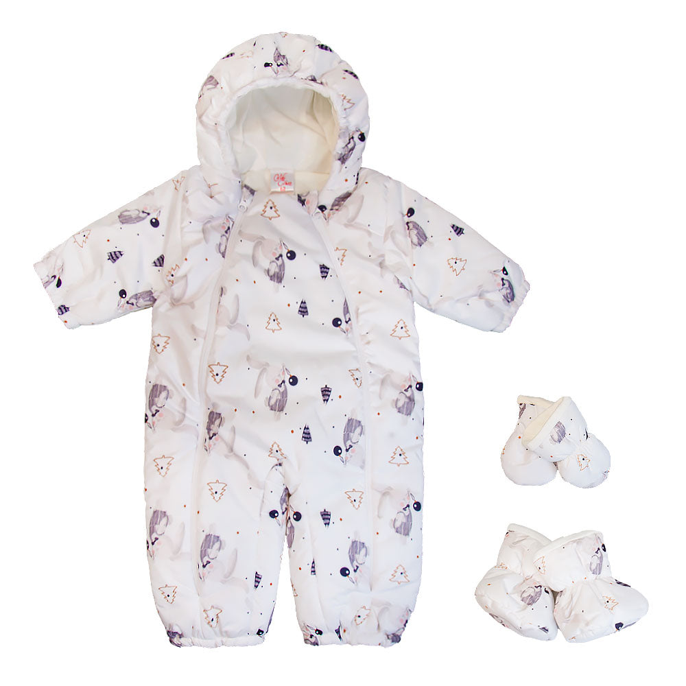 Космонавт с дълга ръка за новородено с еластични маншети. Качулка с ластик. Закопчаване с двоен преден цип. Дизайн с щампи. Разполага с ръкавички и терлички, които се свалят.